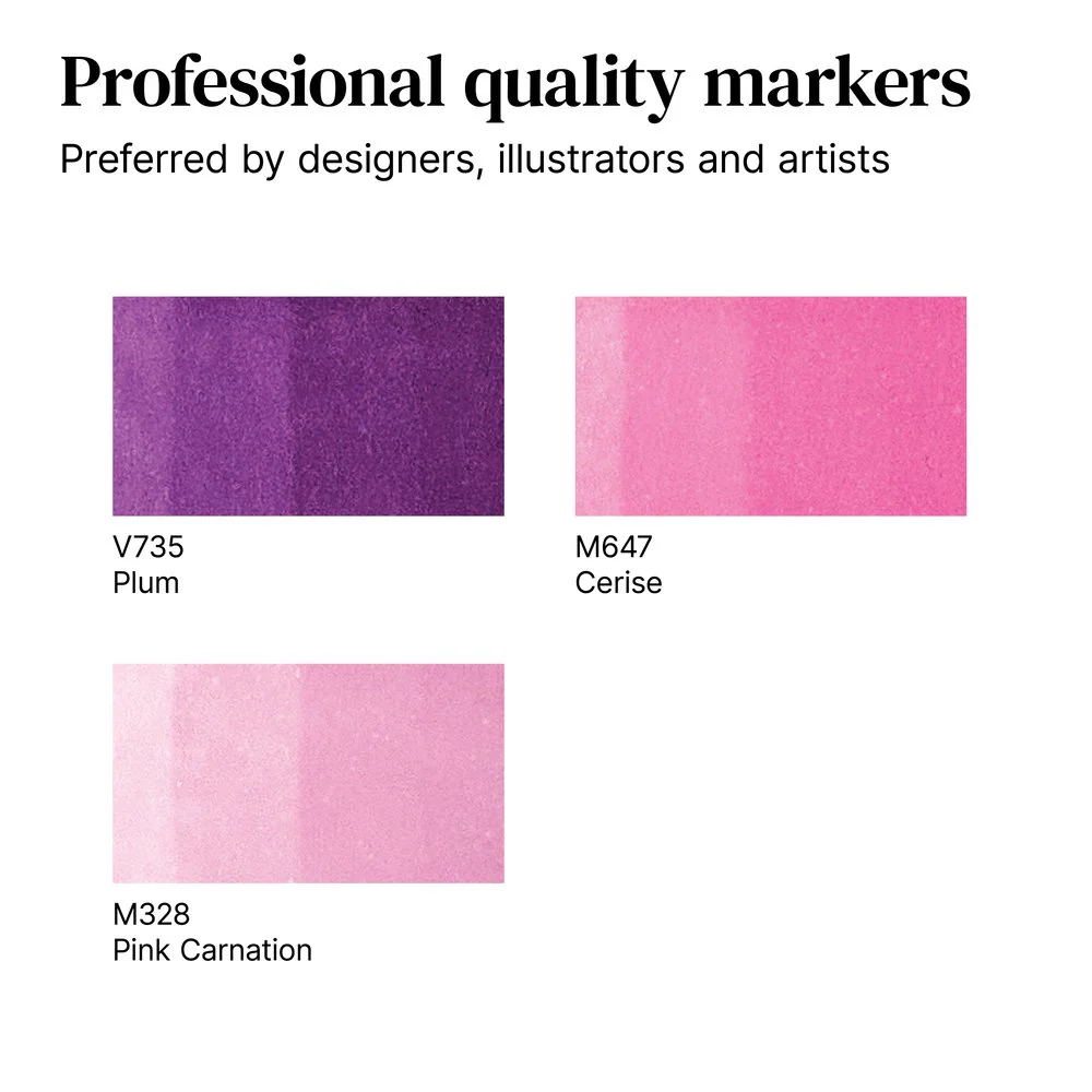 Pink Tones - Alcohol-based translucent ink, twin tipped markers; small bullet nib and broad chisel nib